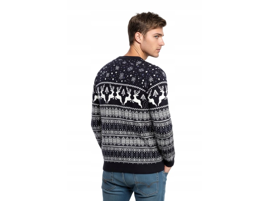 ✨ Tip: Tento tmavomodrý vianočný sveter vynikne v kombinácii s rifľami alebo béžovými nohavicami – ideálny aj na elegantné párové fotky pri stromčeku.