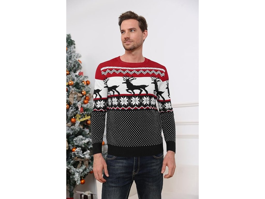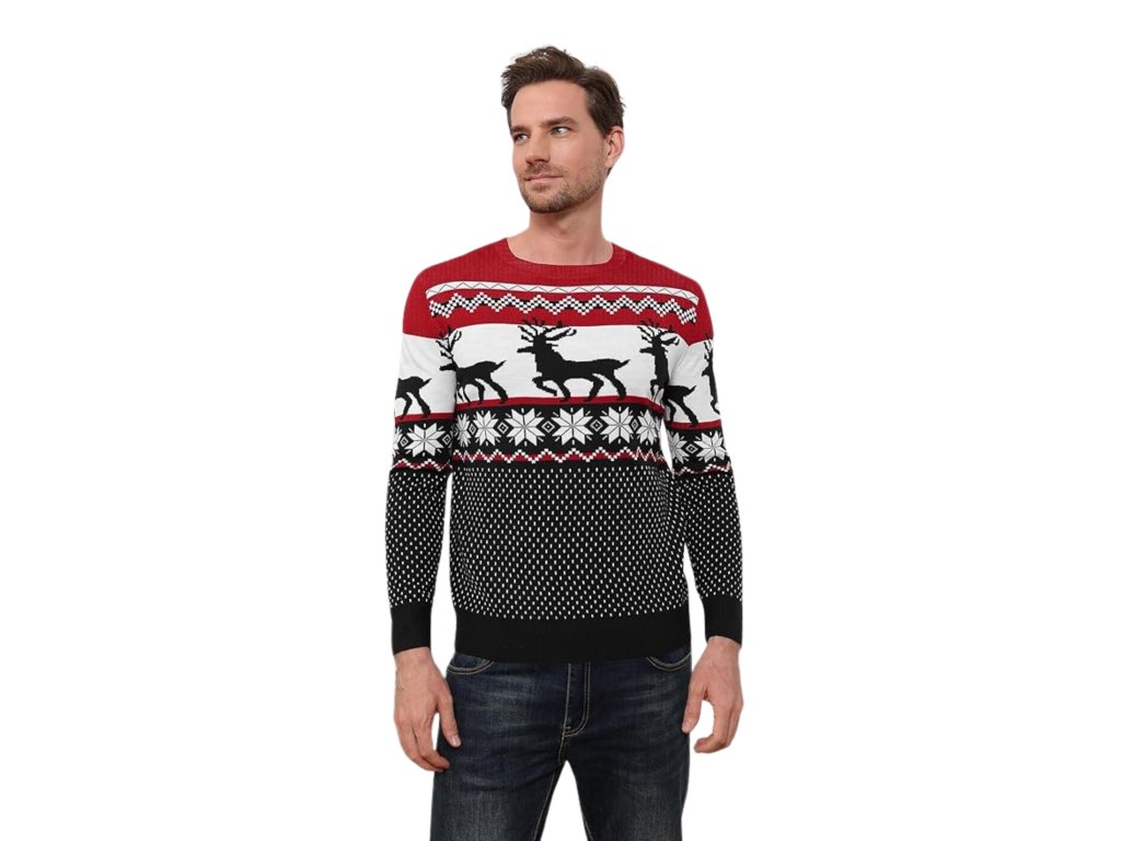 Červeno-modrá kombinácia s bielymi sobmi a vločkami dodáva svetru svieži zimný charakter a ľahko sa kombinuje s džínsami, chino nohavicami či košeľou. Je ideálny na vianočné večierky, rodinné oslavy alebo neformálne stretnutia v predvianočnom období. Nechýba ani klasický okrúhly výstrih, ktorý dotvára elegantný vzhľad.