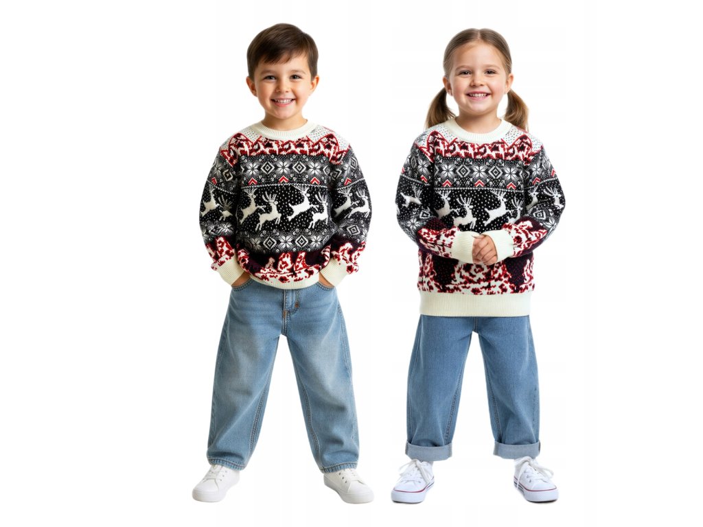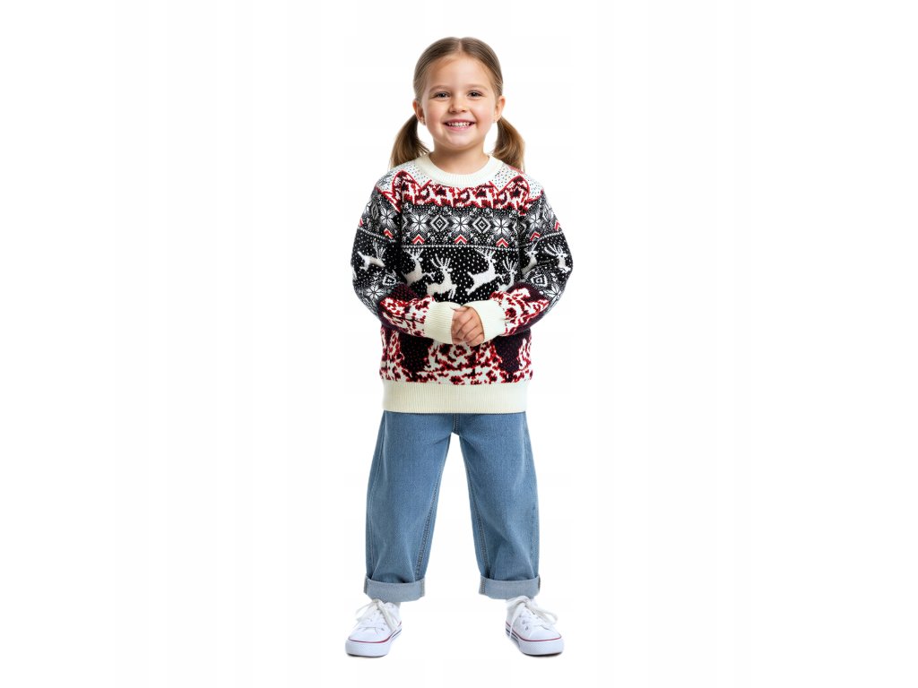 Tento detský vianočný sveter v elegantnej kombinácii čiernej, bielej a červenej je ako stvorený pre sviatočné chvíle. Klasický nórsky vzor so sobmi, vločkami a stromčekmi dopĺňa jemný kontrast farieb, ktorý pôsobí luxusne a pritom detsky hravo. Úplet je mäkký, hrejivý a príjemný na dotyk – ideálny do chladných zimných dní.