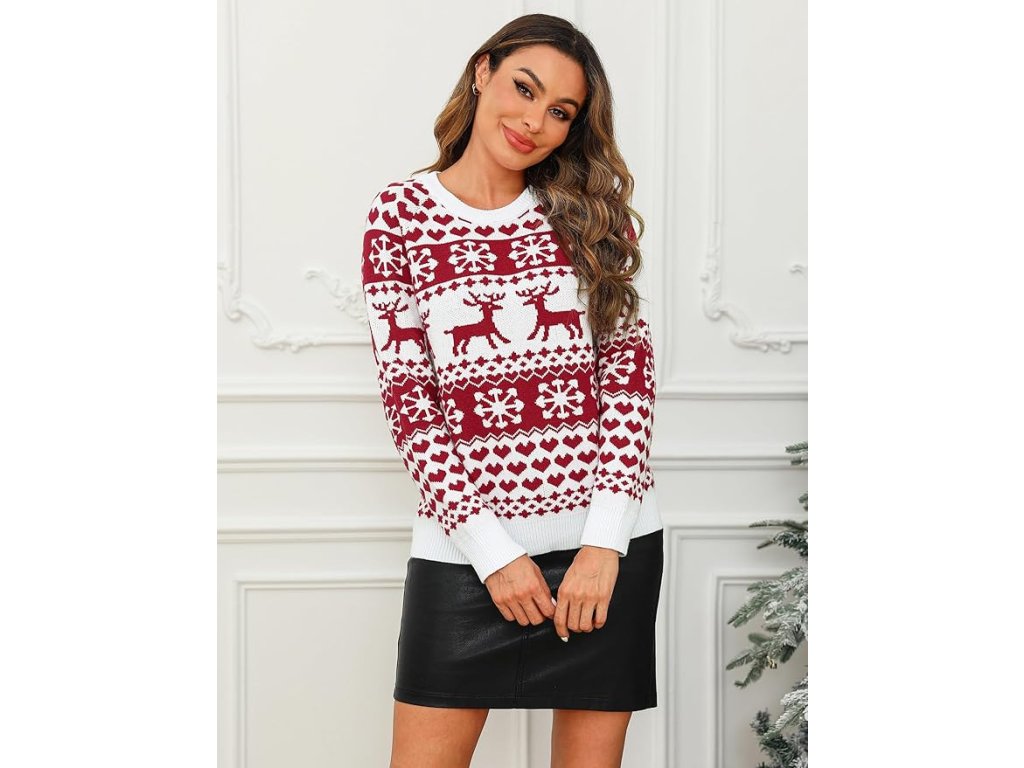 Vykroč do zimy v pohodlí a štýle s týmto dámskym vianočným svetrom v romantickej bielo-bordovej kombinácii. Je vyrobený z jemného, pružného a priedušného úpletu, ktorý ťa zahreje počas chladných dní a poskytne komfort po celý deň. Je ideálny na vianočné stretnutia, zimné prechádzky aj sviatočné fotenia.