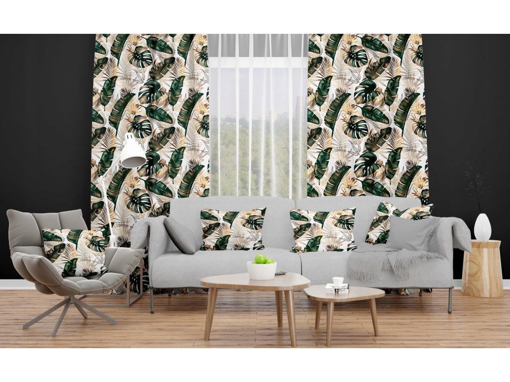 🌴 Tip pre vás: Záves Jungle Tropic White vynikne v svetlom interiéri s prírodnými materiálmi ako drevo či ratan.