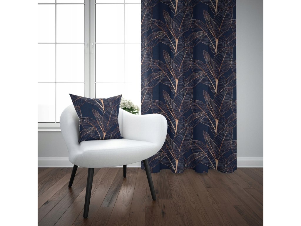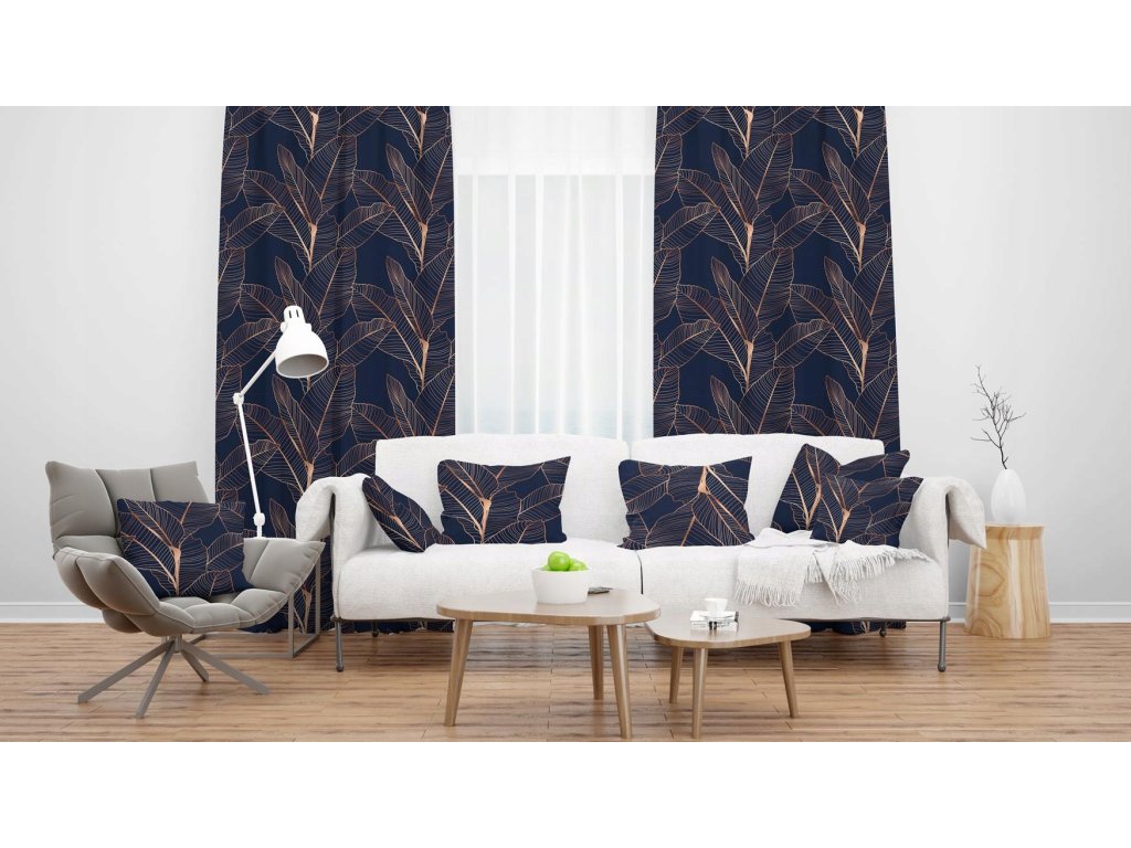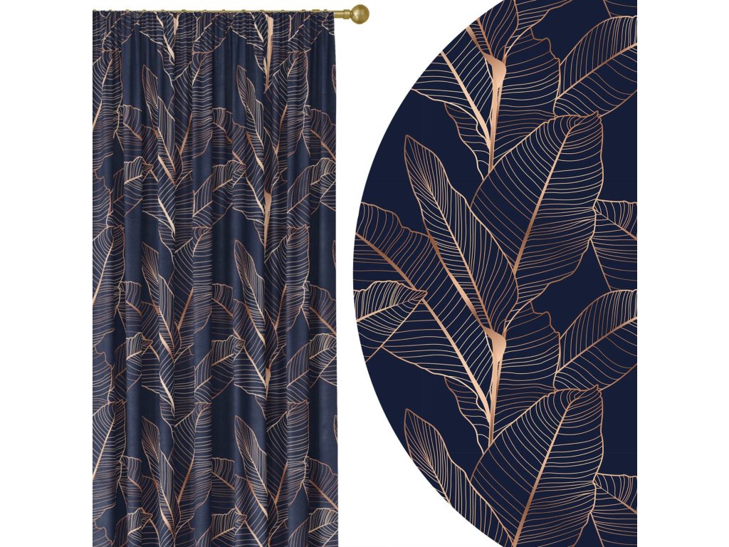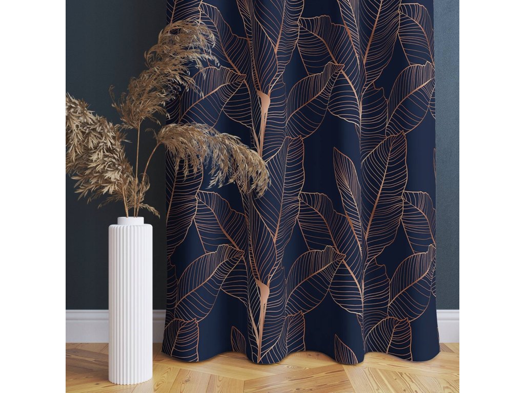 Zatemňovací záves Jungle Navy s bronzovými listami na tmavomodrom pozadí