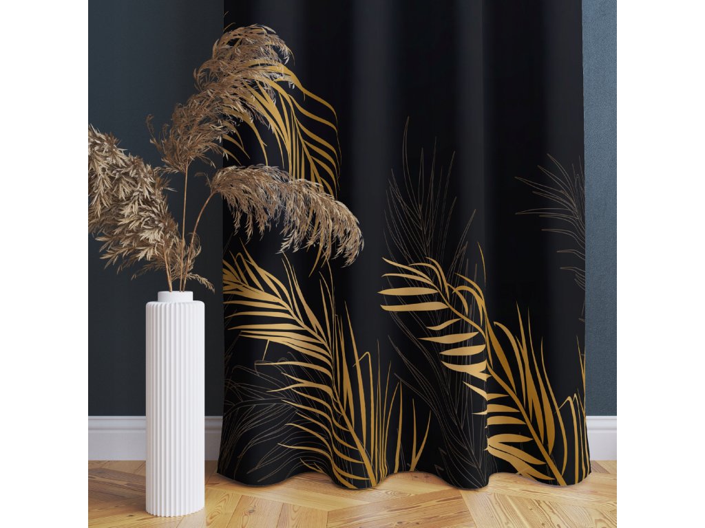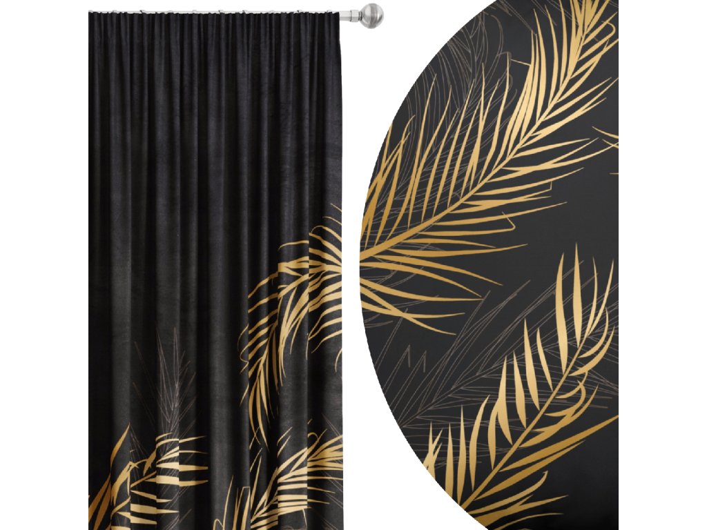 Zatemňovací záves Noir Palms – čierno-zlatý listový vzor s luxusným nádychom