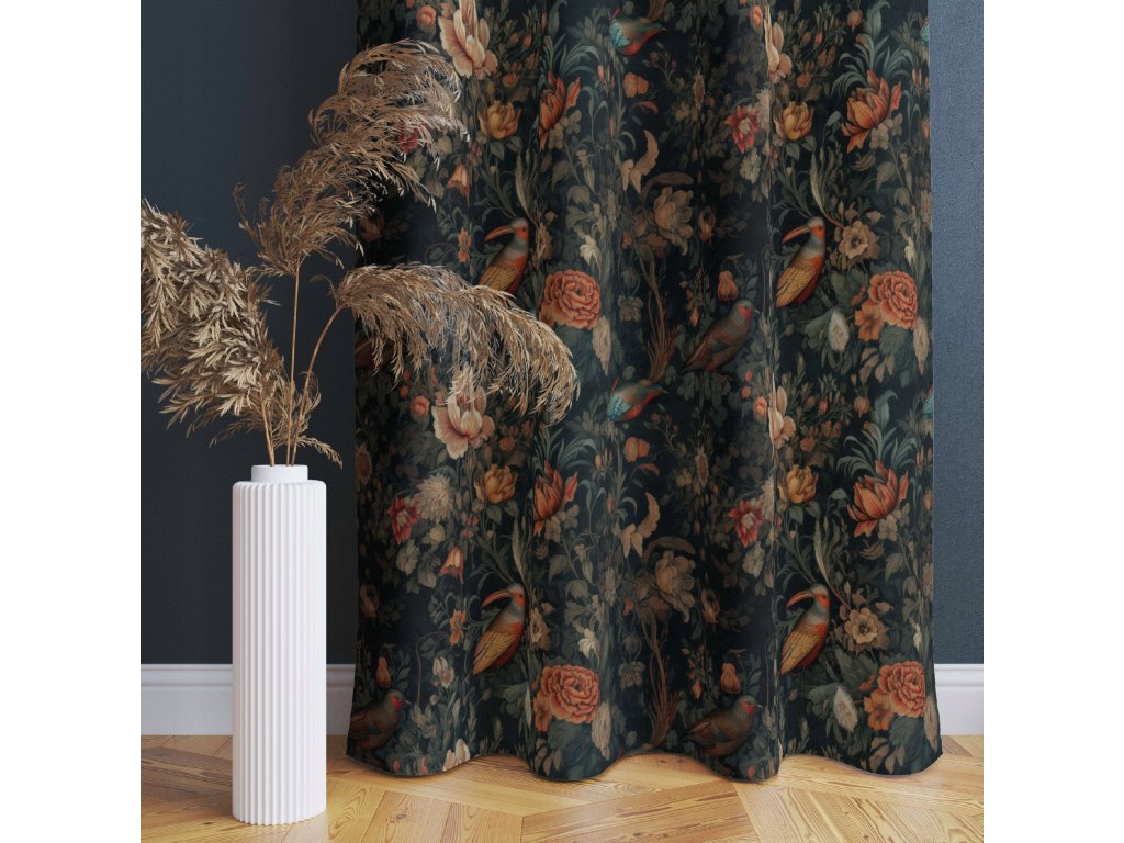 Zatemňovací záves Botanica Birds – tmavozelený podklad, kvety a exotické vtáky v barokovom štýle