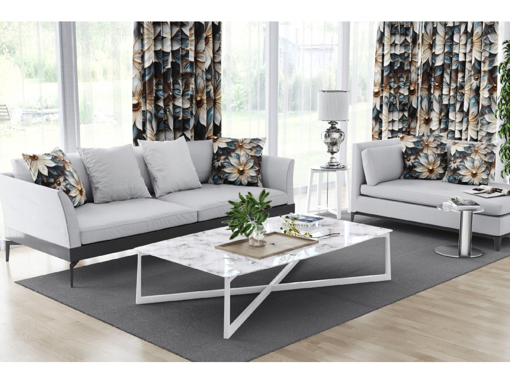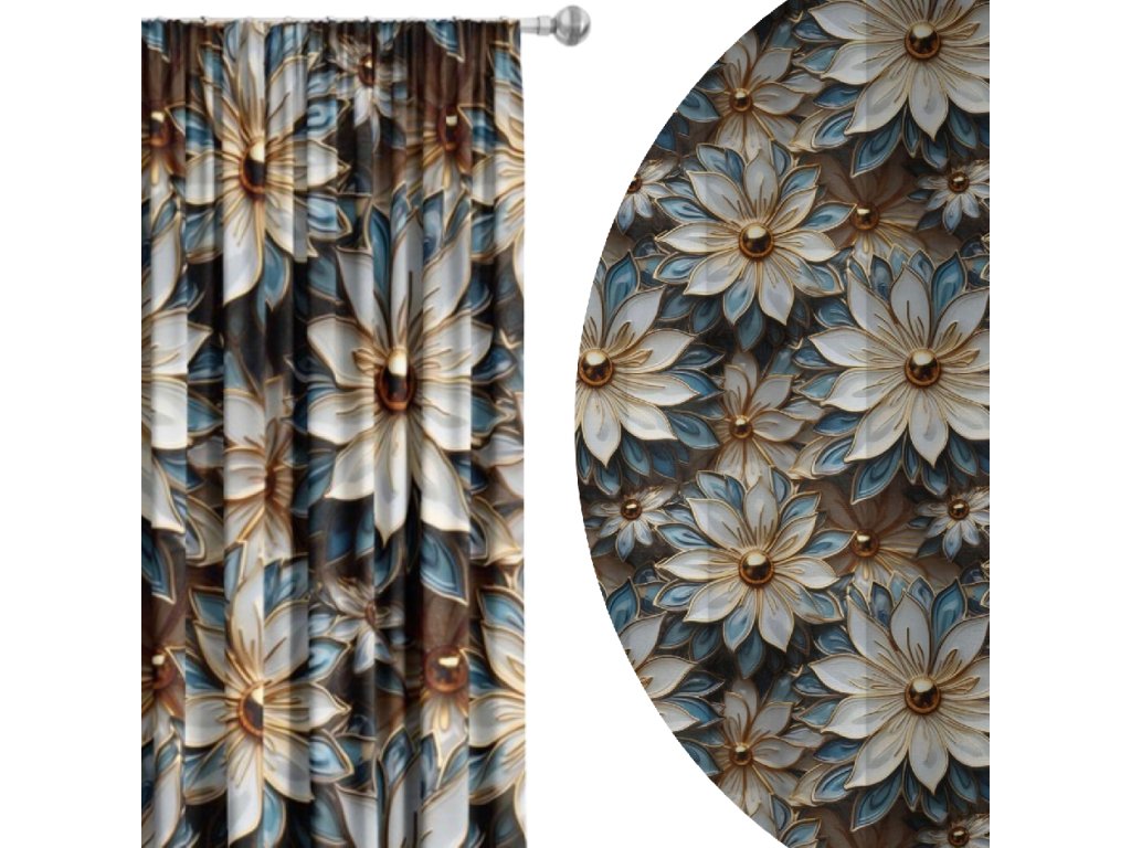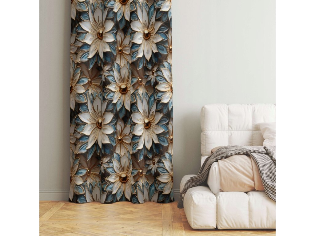 Gold Bloom je výnimočný zatemňovací záves s 3D efektom kvetov, ktorý okamžite upúta pozornosť. Modro-biele lupienky a zlaté stredy vytvárajú noblesný vzhľad, ktorý dokonale doplní elegantné aj moderné interiéry.