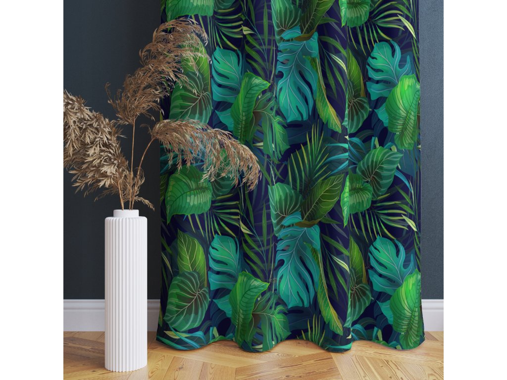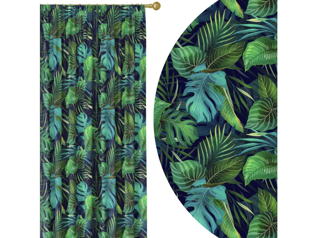 Zatemňovací záves Jungle Midnight – sýtozelené tropické listy na tmavomodrom podklade