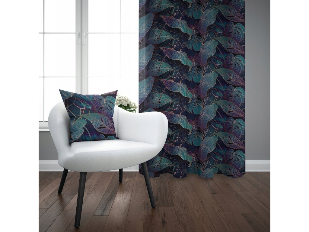 Zatemňovací záves s listovým vzorom v petrolejovej, fialovej a zelenej farbe