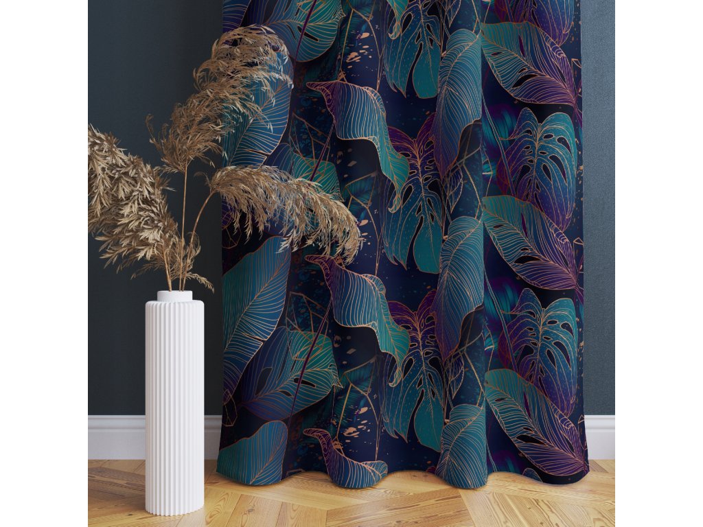 Zatemňovací záves Emerald Night – listový vzor v petrolejovej, fialovej a zelenej