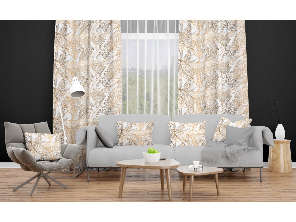 Zatemňovací záves Golden Lines ponúka luxusnú eleganciu v podobe zlatého listového vzoru na jemne bielom pozadí. Vďaka príjemnému materiálu s hustou väzbou efektívne zatemňuje, chráni súkromie a zároveň pôsobí esteticky. Je vybavený riasiacou páskou pre jednoduché zavesenie a nevyžaduje žehlenie – ideálny do spální, obývačiek či pracovne.