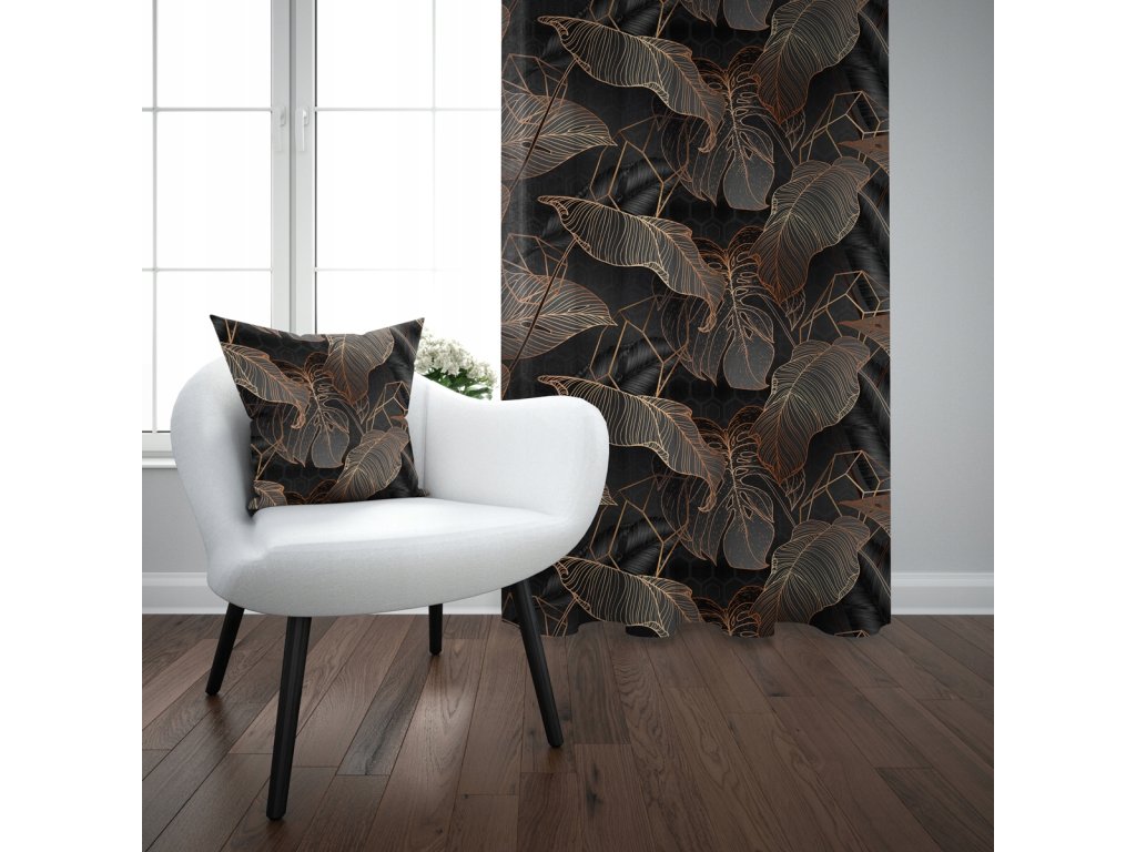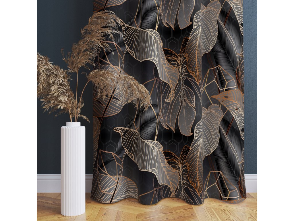 Zatemňovací záves Copper Luxe je výnimočný doplnok do moderného a elegantného interiéru. Kombinuje čierny podklad s luxusným medeným vzorom listov a jemnou geometriou, čím vytvára sofistikovaný vizuálny efekt. Záves sa jednoducho zavesí pomocou riasiacej pásky a vďaka odolnému materiálu nie je potrebné ho žehliť. Vhodný aj na zatemnenie miestnosti a zvýšenie súkromia.