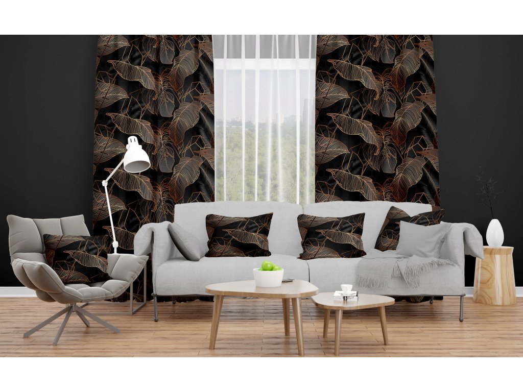 Zatemňovací záves s medeným listovým vzorom na čiernom pozadí