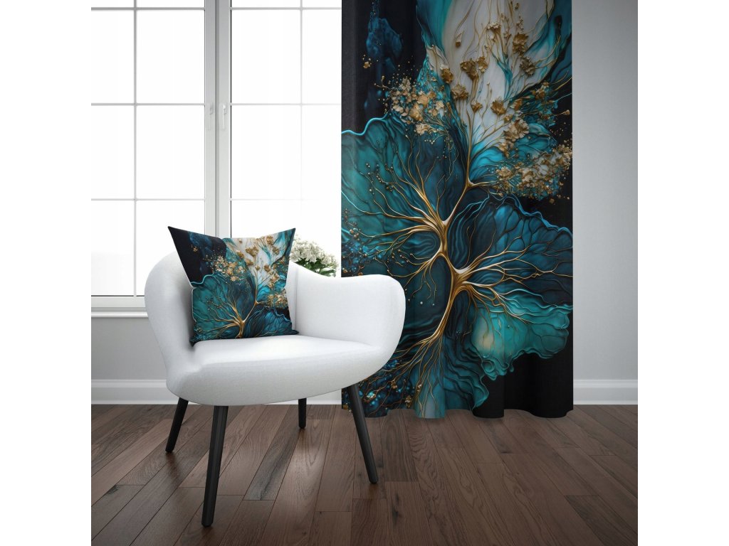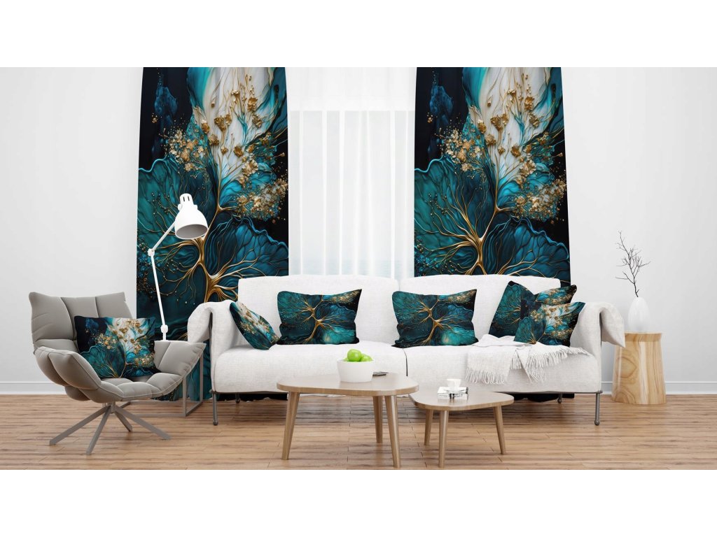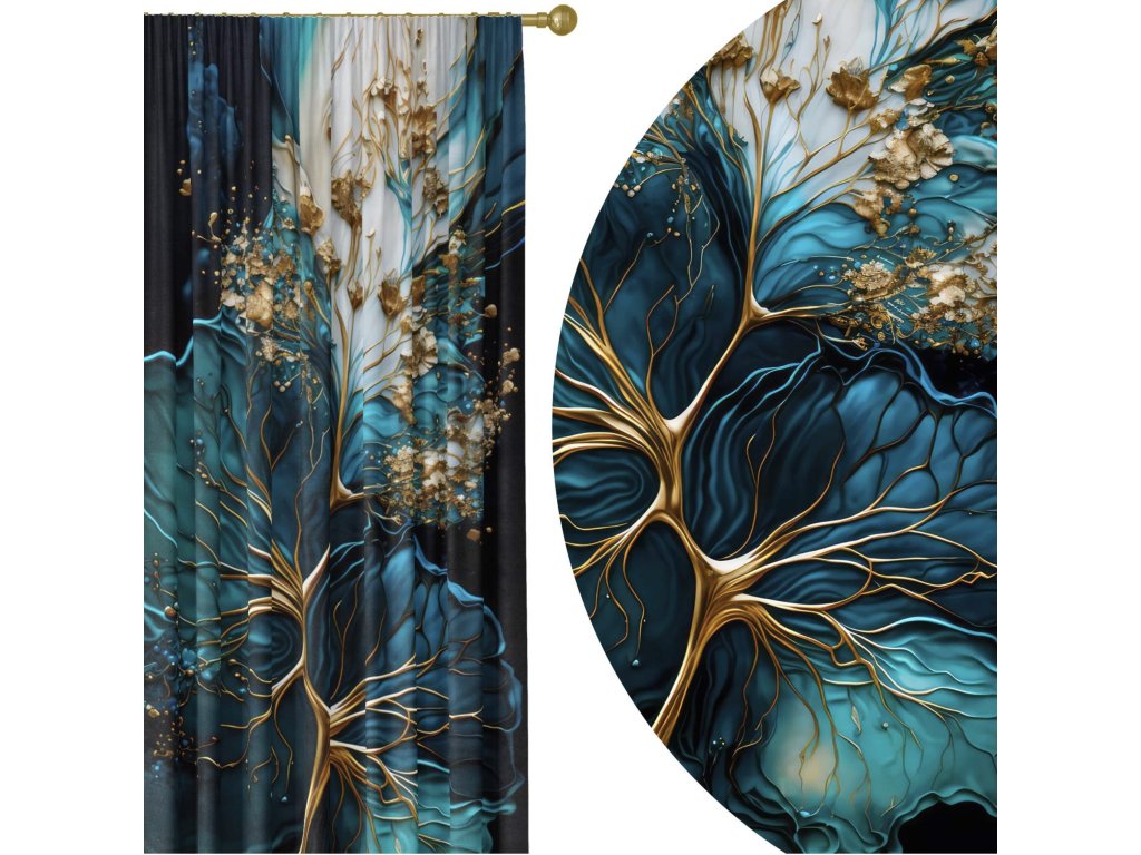 Zatemňovací záves Golden Roots prinesie do vášho domova unikátny vizuálny zážitok. Symbolický strom života v zlatom prevedení kontrastuje s hlbokými modrými odtieňmi a vytvára pocit hĺbky a mystiky. Záves nielenže ozdobí váš priestor, ale zároveň efektívne zatemní miestnosť a poskytne súkromie aj pohodlie. Vďaka praktickej riasiacej páske sa jednoducho zavesí na koľajnicu aj garníž.