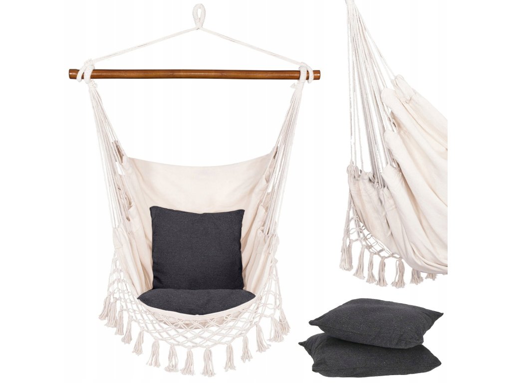 Závesné brazílske kreslo boho s vankúšmi – krémové so sivými poduškami, 130 × 100 cm
