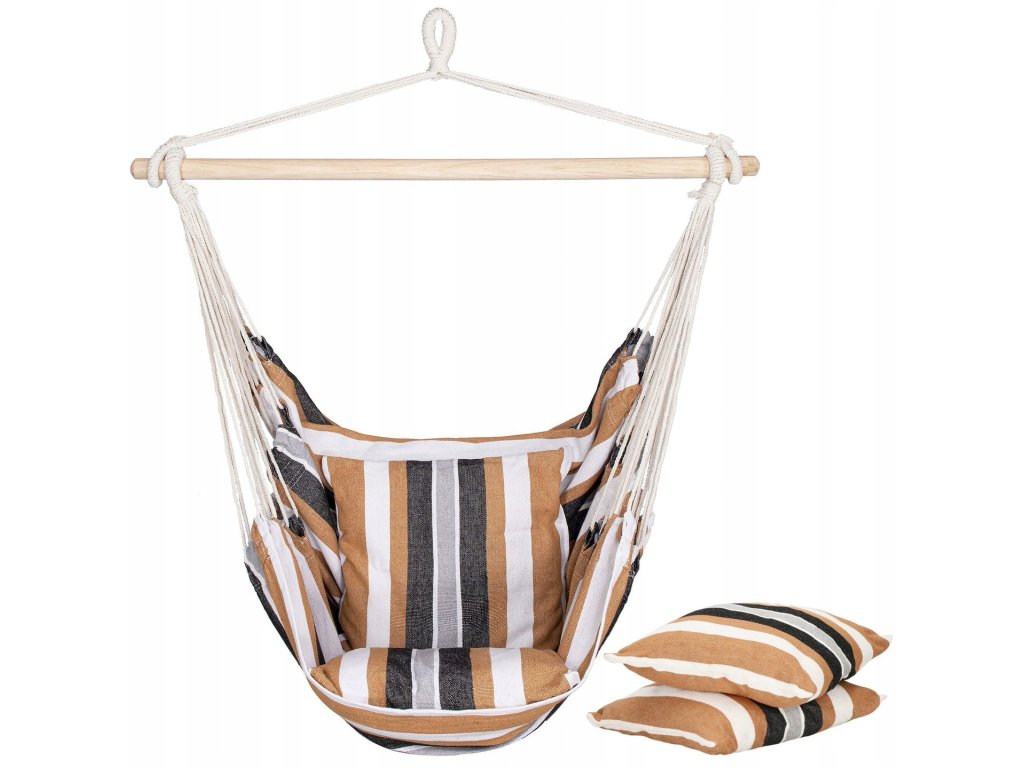 Pohodlné závesné brazílske kreslo v modernom pruhovanom dizajne je ideálnym riešením pre každého, kto hľadá oddych s dotykom štýlu. Pevná konštrukcia s drevenou tyčou a mäkký textilný sedák s dvoma poduškami poskytujú komfort pri čítaní, relaxe či opaľovaní. Béžovo-sivo-biele pruhy zaručene oživia každý priestor – od terasy až po interiér.