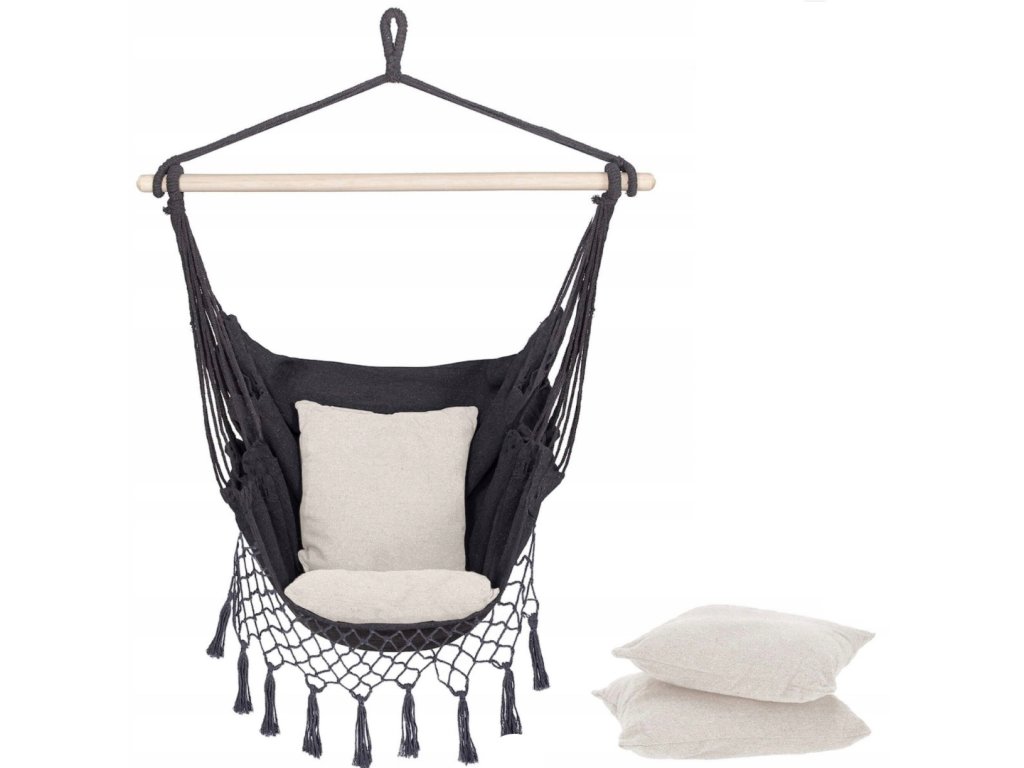 Toto závesné brazílske kreslo v elegantnej čiernej farbe s kontrastnými krémovými vankúšmi je dokonalým spojením pohodlia a štýlu. Vďaka pevnej drevenej tyči a priedušnému materiálu sa výborne hodí do interiéru aj exteriéru. Nechýba praktická bočná kapsa na mobil alebo knihu, boho strapce a kvalitné spracovanie pre dlhú životnosť.