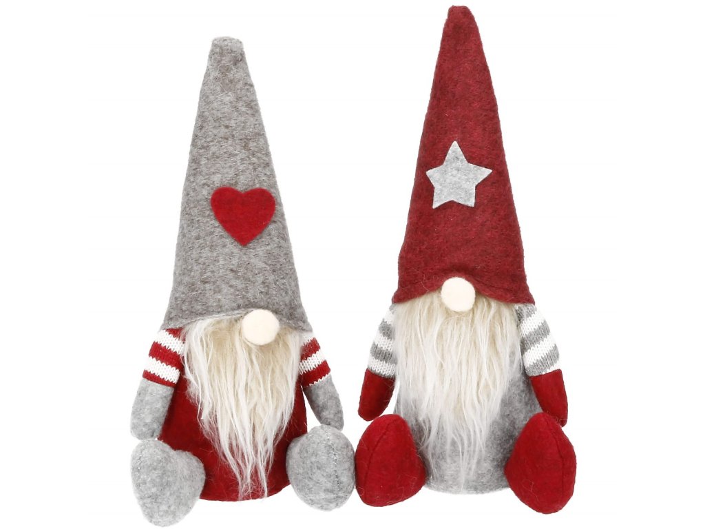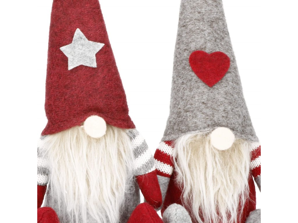 Sada 2 vianočných škriatkov – sediace dekorácie s bradou, srdcom a hviezdou 26 cm (červeno-sivé)